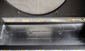 Na parte de baixo é possível ver um disco giratório de titânio que realiza o desbaste dos trastes. Este disco é todo “talhado” na fábrica com brocas de diamante e o processo leva cerca de 10 horas.