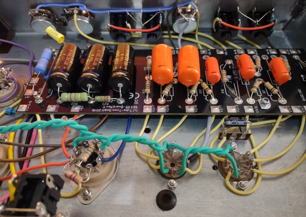 É difícil de ver, mas na linha verde mesmo colada nos trastes existe uma linha laranja visível em apenas alguns pontos.
