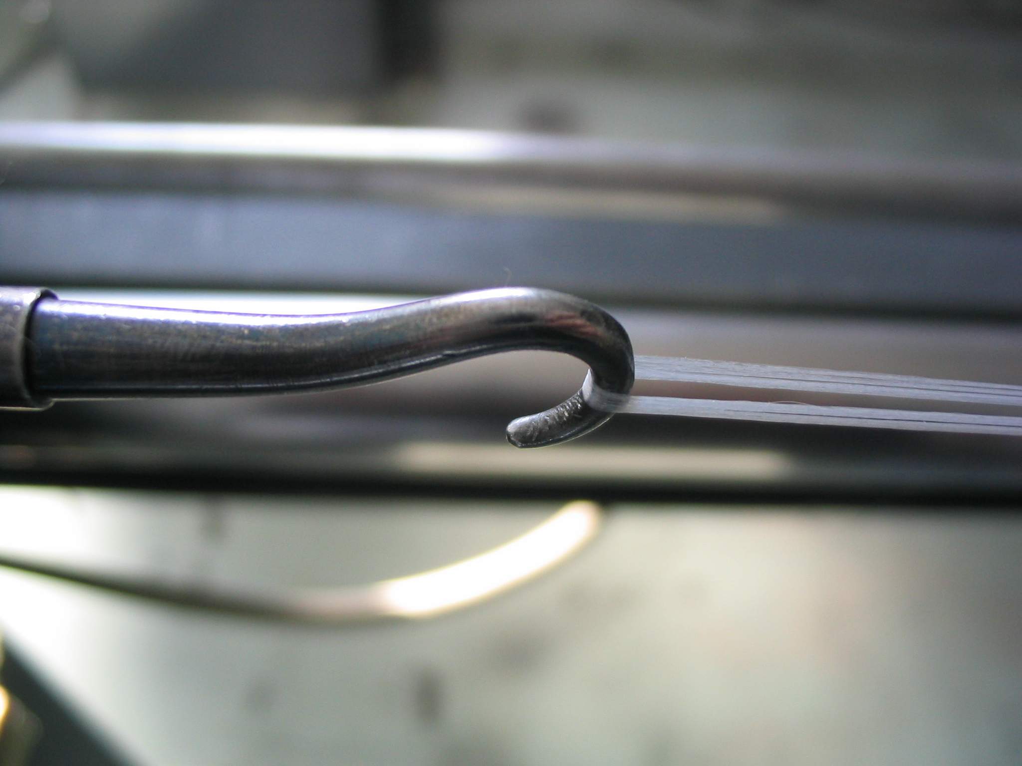 No topo da foto é possível ver a broca utilizada para realizar trabalhos no nut, na parte central este pino que parece de latão percorre as cordas, trastes e toda a escala para medir as dimensões.