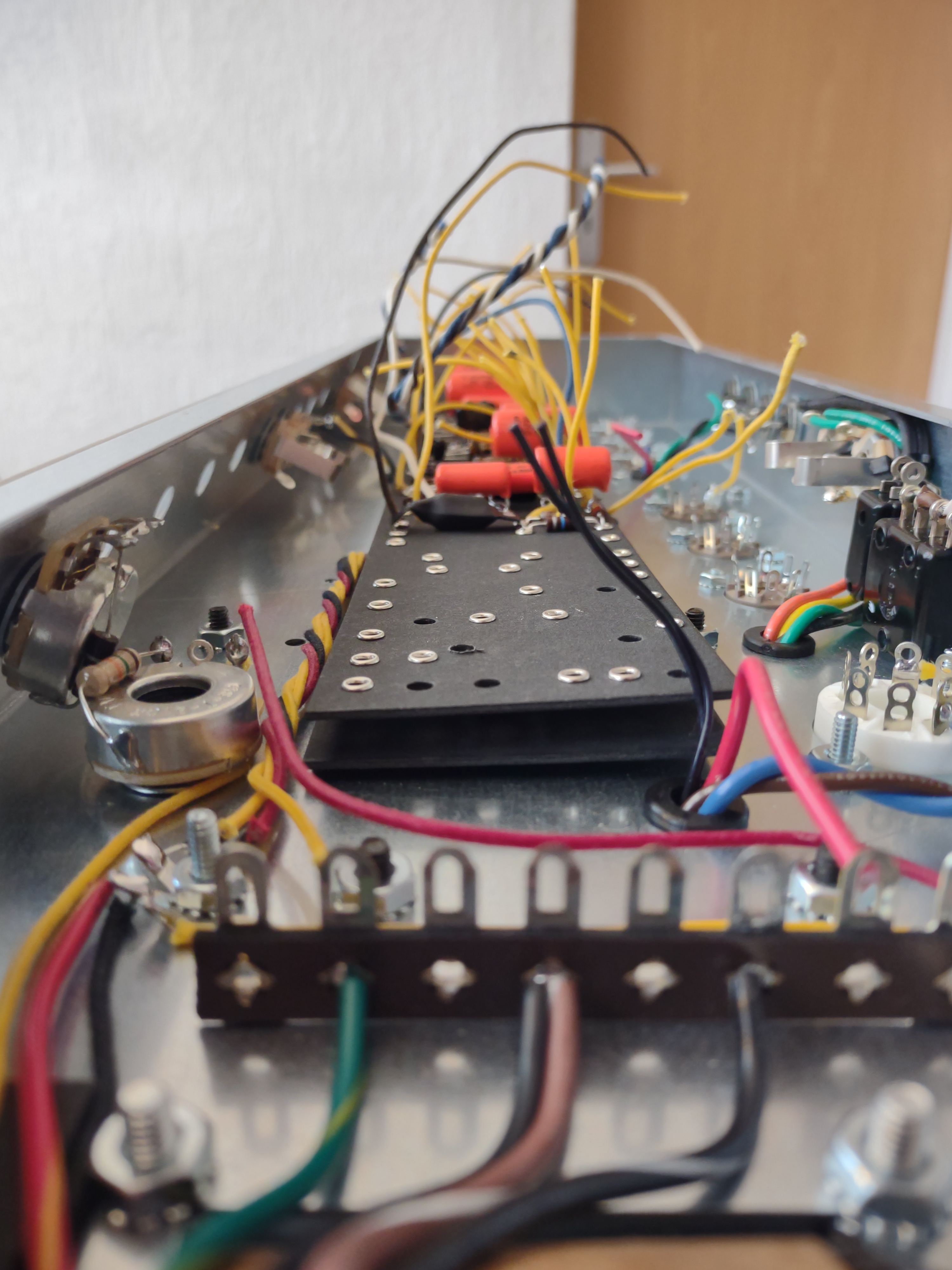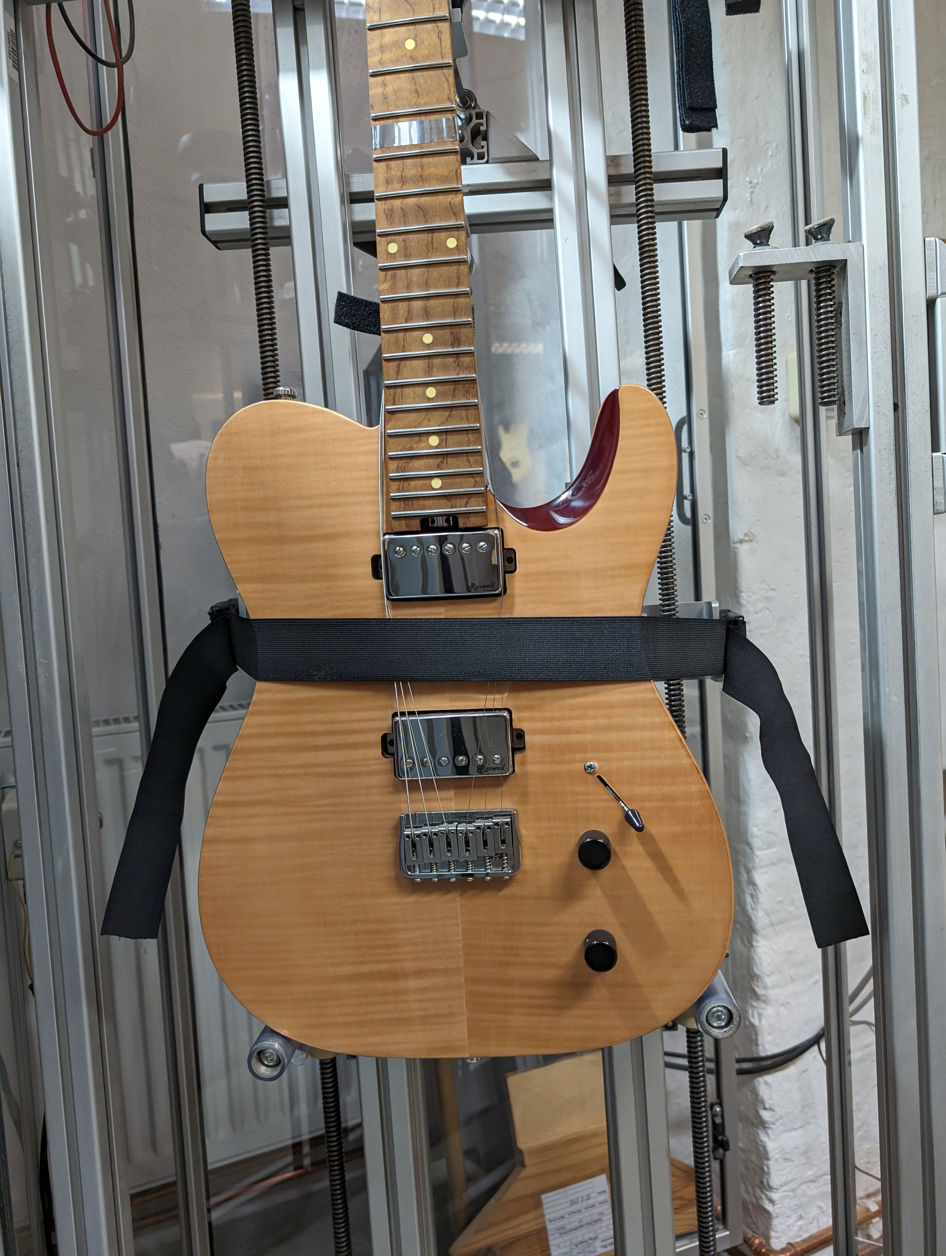 A guitarra tem trastes inox e além de não terem nenhum desgaste, o que é normal, eram extremamente altos e tínhamos muito material para trabalhar, foi então que surgiu a ideia de deixar a guitarra ainda mais confortável criando um raio composto.