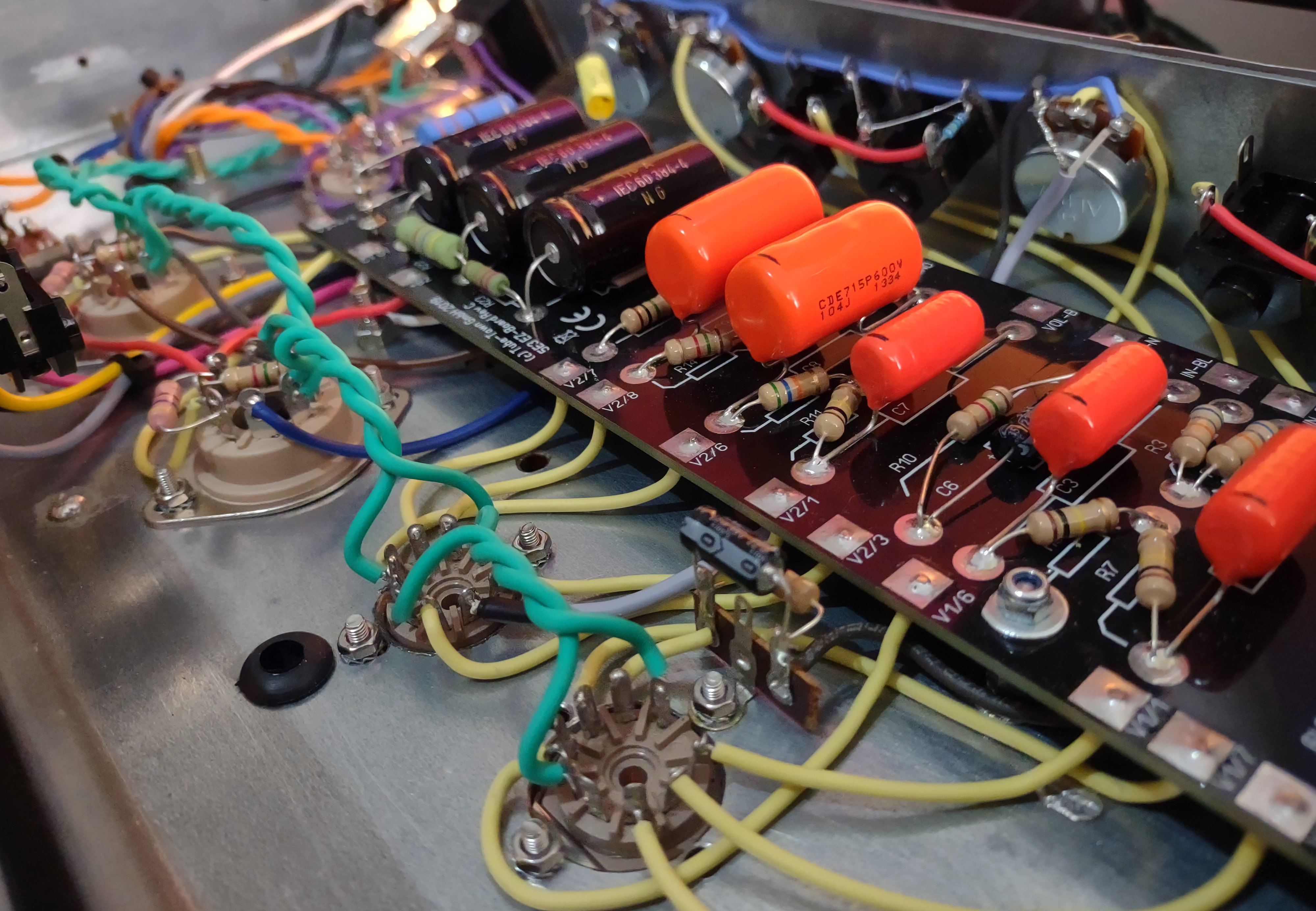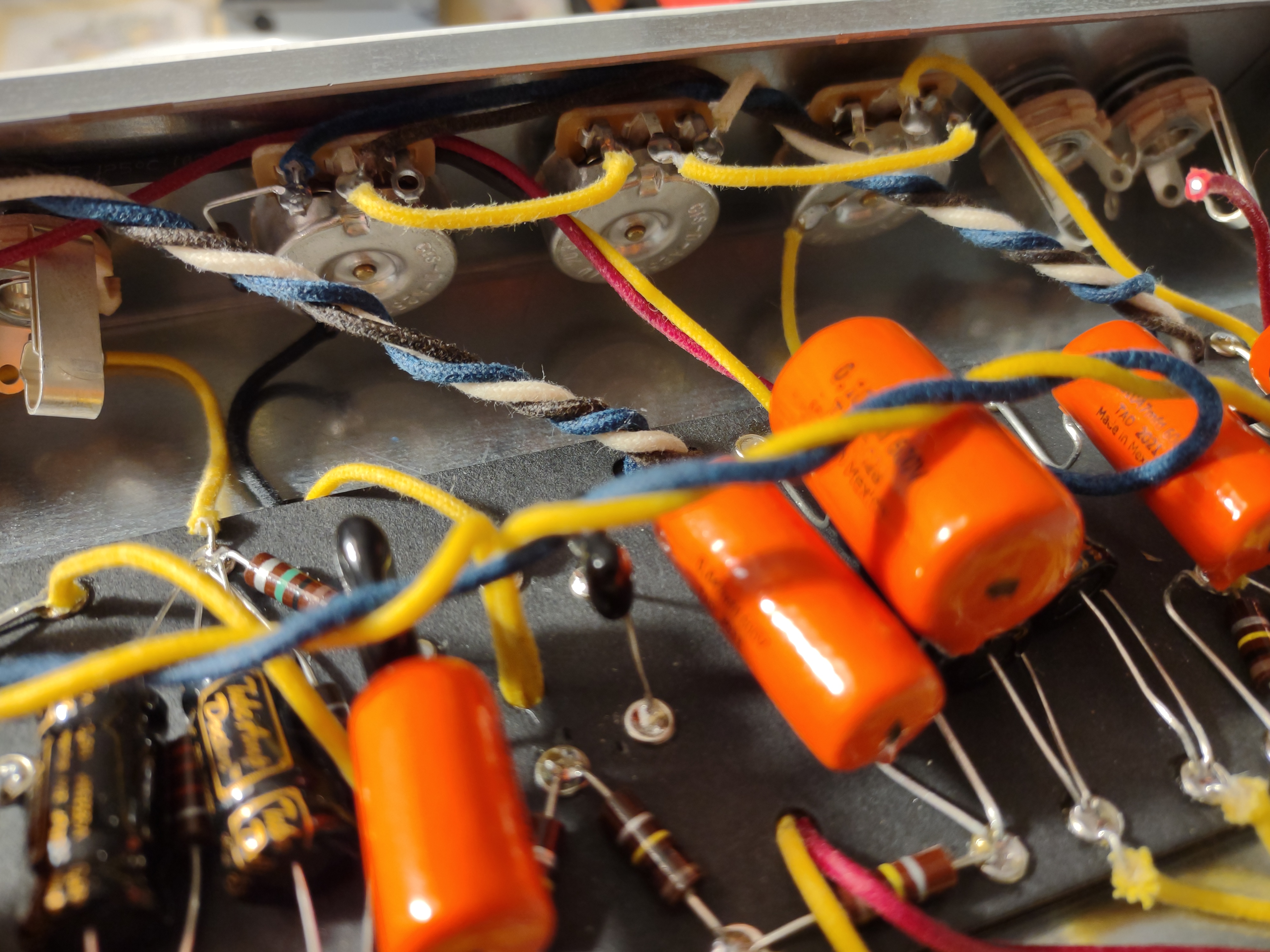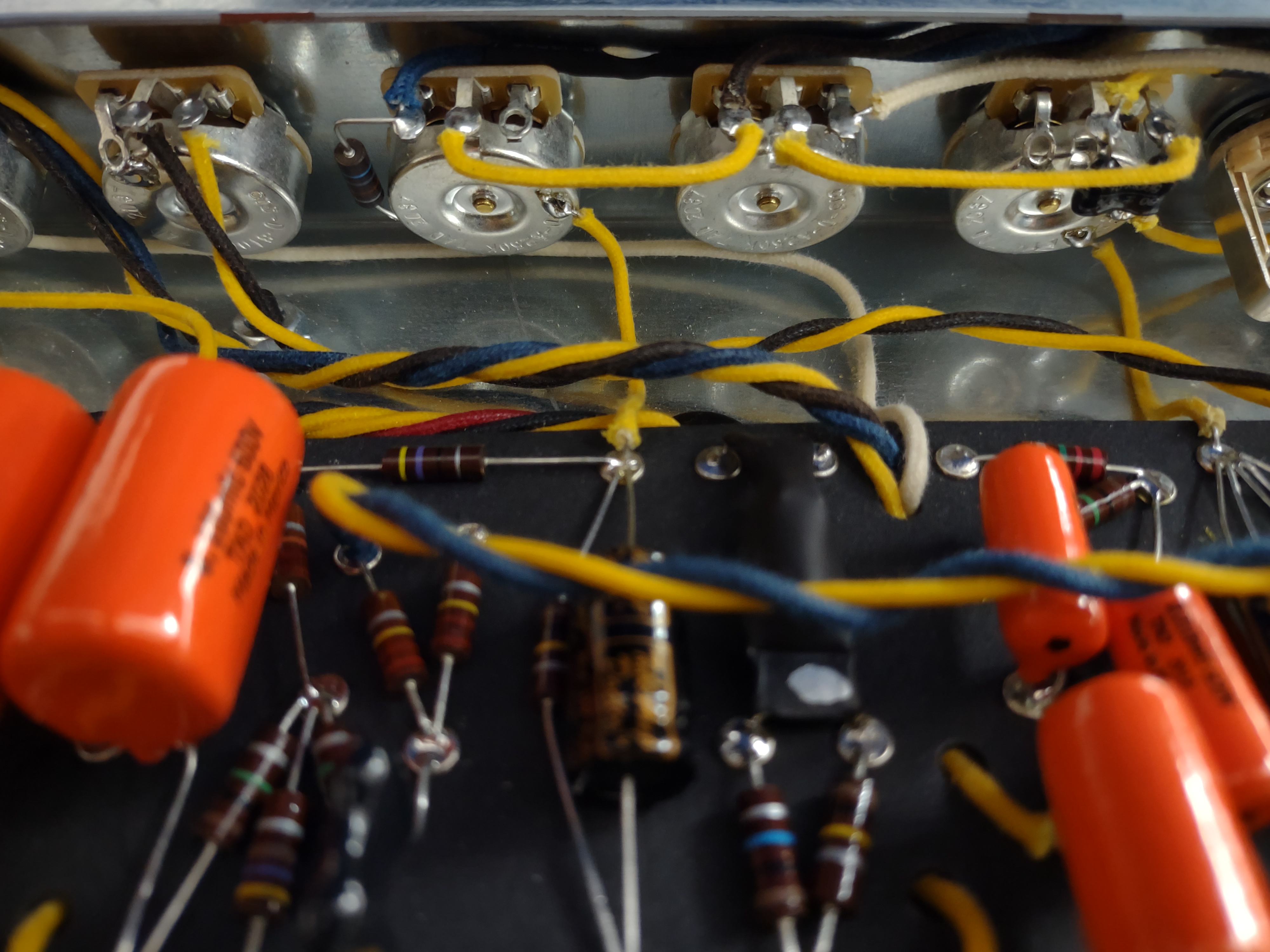É difícil de ver, mas na linha verde mesmo colada nos trastes existe uma linha laranja visível em apenas alguns pontos.