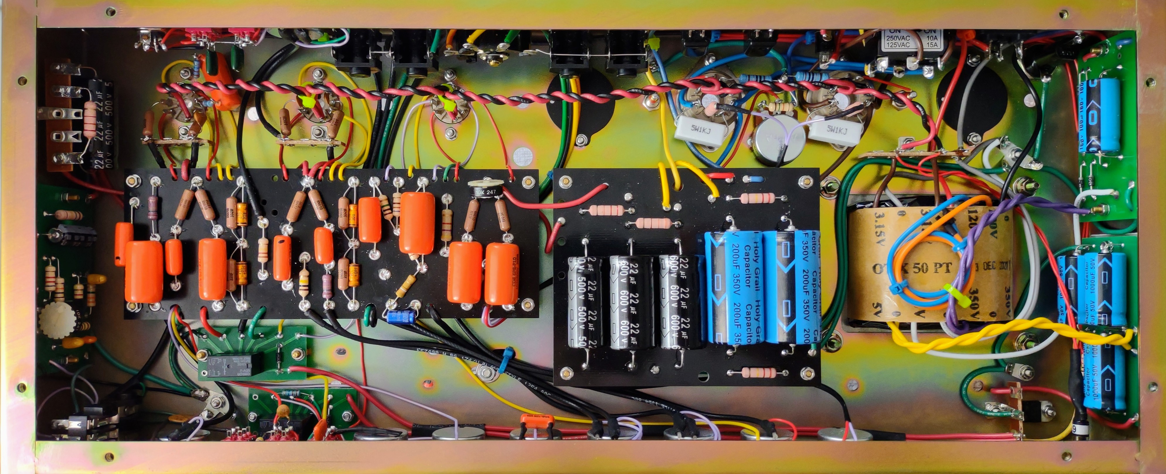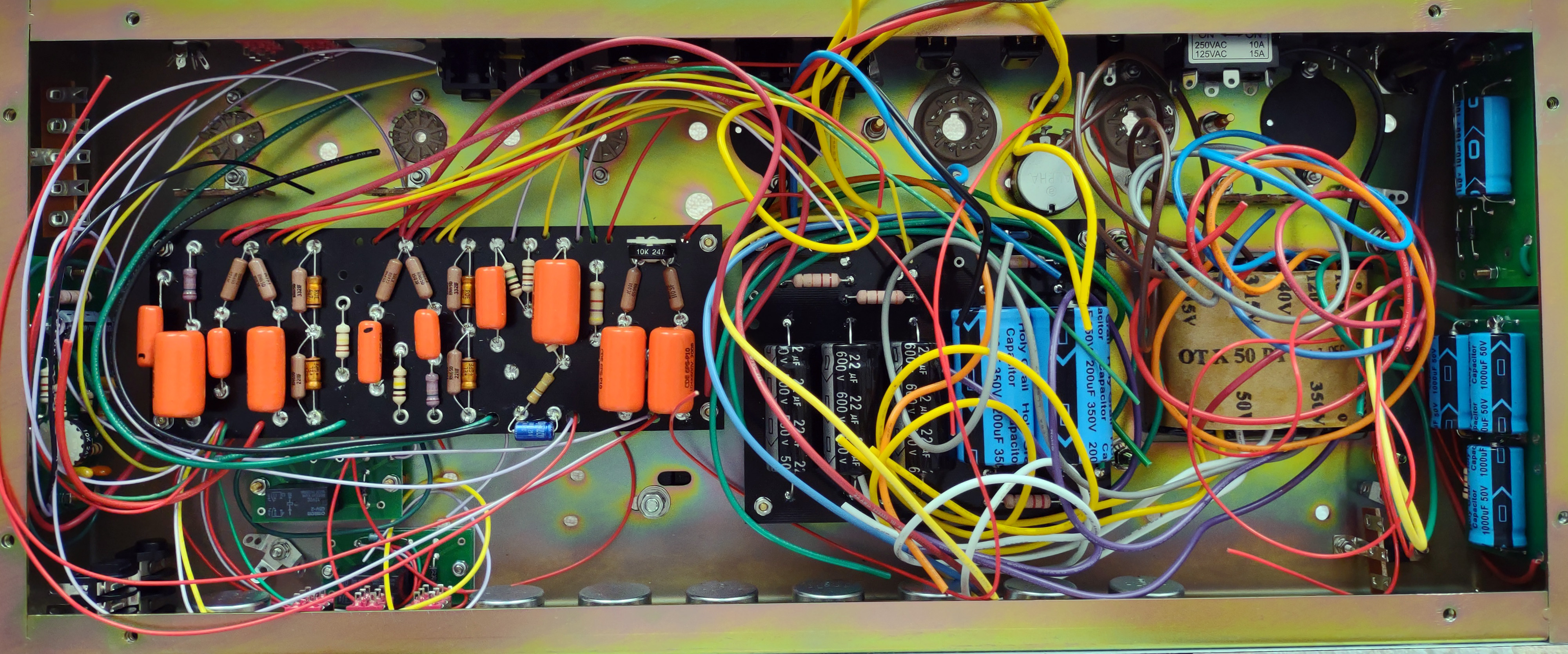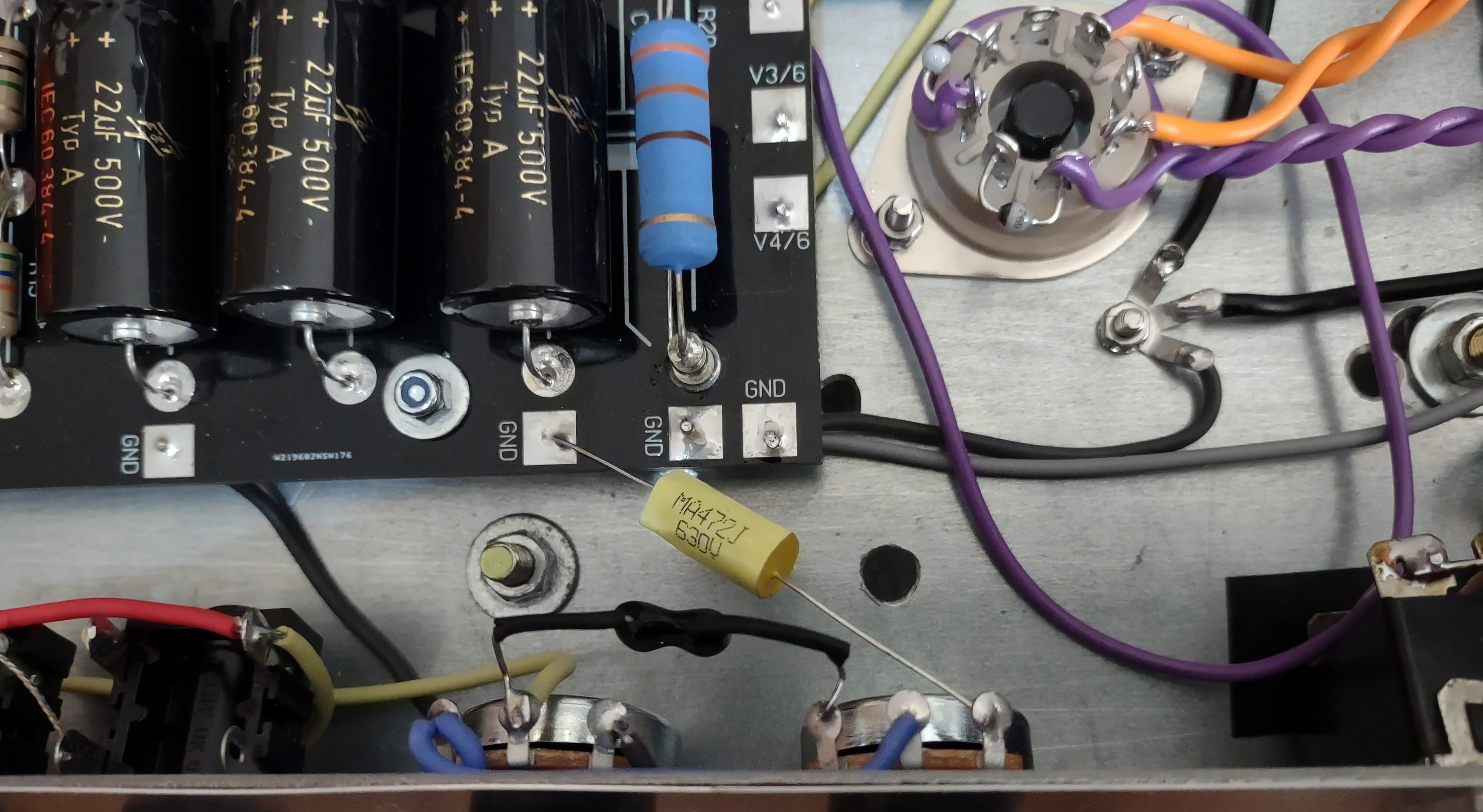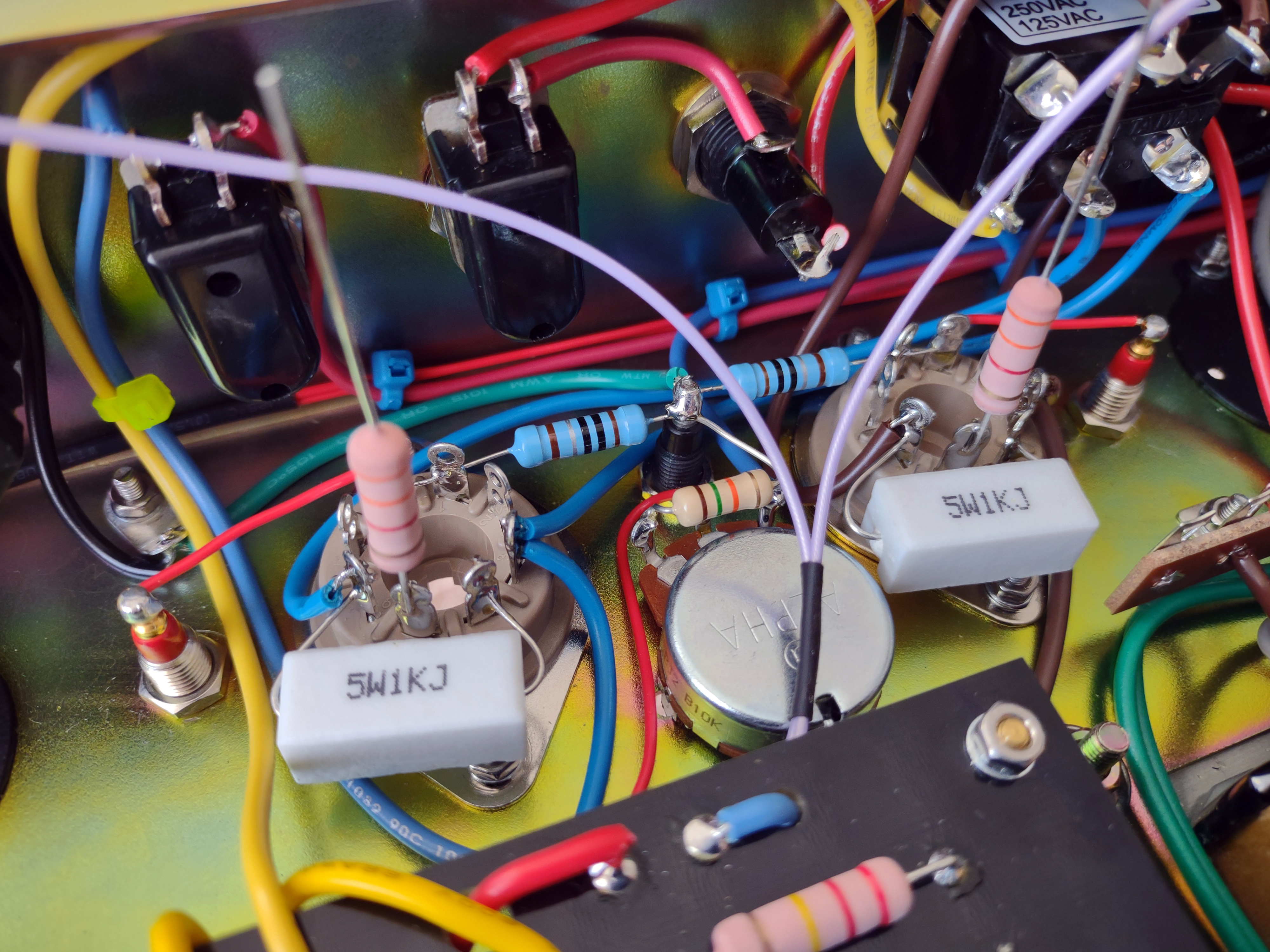 É difícil de ver, mas na linha verde mesmo colada nos trastes existe uma linha laranja visível em apenas alguns pontos.