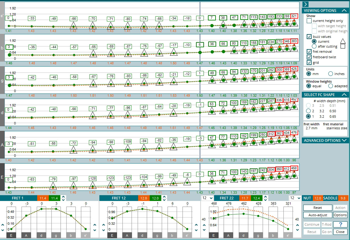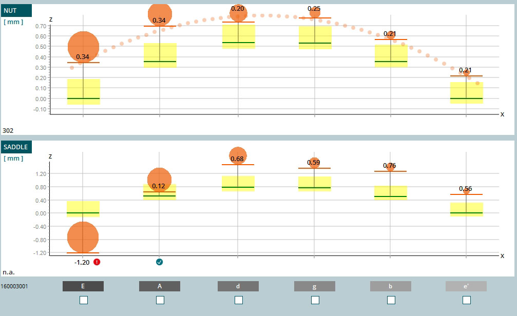 Com essas duas medições a máquina consegue comparar e determinar como esse braço responde com as cordas instaladas e também quais são as correções necessárias a serem feitas. Abaixo o resumo da situação da ação das cordas. Um pouco altas para um instrumento com abordagem moderna, mas na condição que estava não tinha como deixar mais baixa.