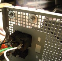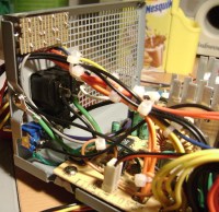 A fonte por dentro é bem organizada e não tem muitos fios. A fiarada fica mesmo é para fora e termina nos bornes de conexão de hd e demais dispositivos que um computador precisa. Escolhi a grade traseira da fonte para montar o painel como podem ver na foto.