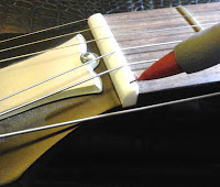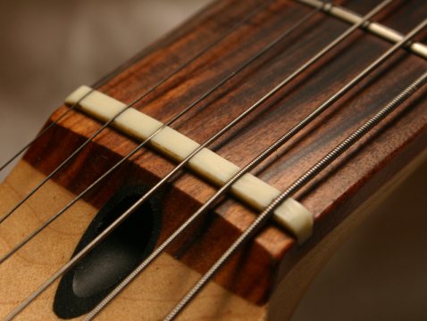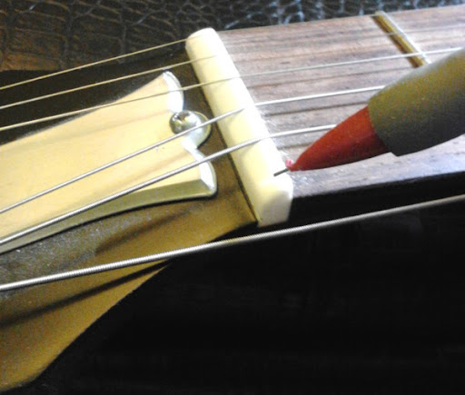Osso: O material mais utilizado nas guitarras. É um material duro e o desgaste é pequeno. Normalmente prendem um pouco as cordas e gera uns estalos ao afinar e devem ser lubrificados. Uma dica é afastar as cordas e passar um lápis bem afiado ou uma lapiseira fina nas ranhuras das cordas como na foto: