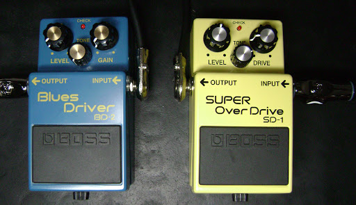 Os pedais escolhidos foram da BOSS, um SD-1 e um BD-2 e foram ligados com baterias.