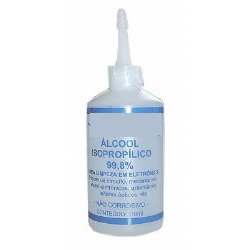 Depois de soldar sempre limpe a placa. Álcool de cozinha não serve. Use álcool isopropílico. Ele é bom para remover restos de fluxo que a solda solta e que deixam a placa toda melada. Pode ser usado para limpar placas, componentes e algumas das ferramentas da sua bancada. Uma garrafinha igual a da foto custa em média 3 reais e dura muito.