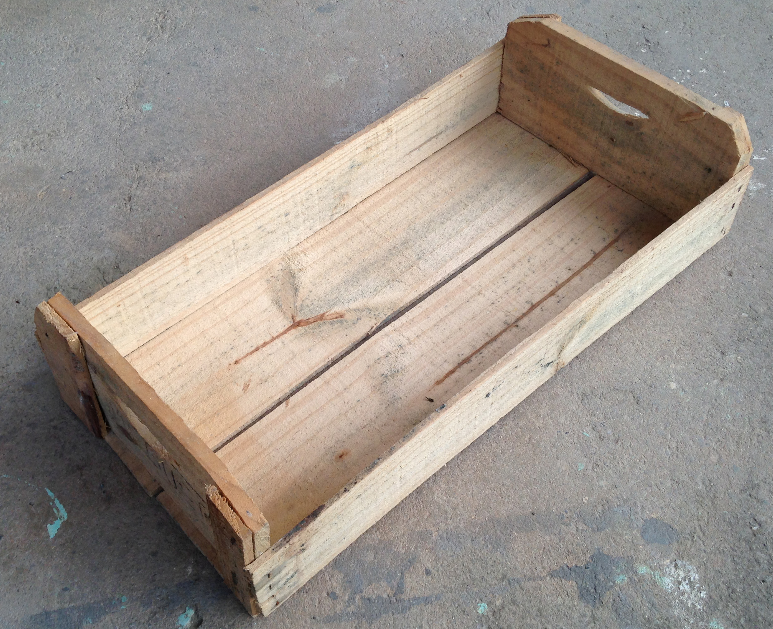 Normalmente estas caixas são feitas em Pinus ou Caixeta. Não recebem nenhum tipo de tratamento mas são resistentes para o transporte de frutas. Assim resolvi iniciar um pequeno projeto que se revelou algo muito bacana. Comecei removendo uma das laterais e fazendo um reforço geral com pregos, já que elas são montadas com grampos e em pouco tempo ficam moles.
