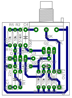 Como disse, não é necessário criar uma placa para o circuito. Mas o meu grande amigo Fábio Luiz desenvolveu um PCI muito legal baseado no esquema que coloquei aqui. Como o potenciômetro é soldado diretamente na placa, elimina o problema de fazer um suporte para ela.
