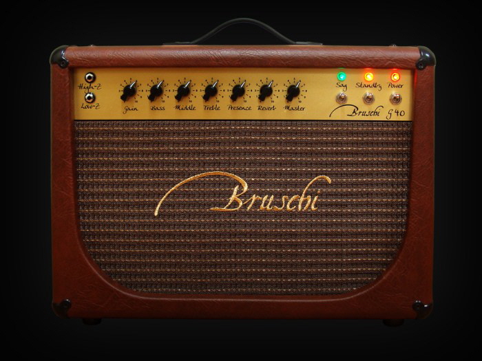 Antes de falar do produto, quero falar da empresa. Fui recebido pelo criador da marca e dos amplificadores, o Edson. Um cara sensacional, profissional e com uma sinceridade magnífica. Não saí de lá sem ele me responder cada pergunta, cada detalhe. Eu como gosto de eletrônica levei uma chuva de perguntas e ele respondeu com grande paciência e sorriso no rosto. A empresa nasceu do conhecimento em eletrônica e amor pela guitarra que o Edson tem. Assim nasceu a Bruschi e o G40. Um amplificador com som próprio, um acabamento que nunca vi em lugar nenhum, e uma forma de pensar o circuito moderna sem esquecer dos traços que originaram a história e o timbre clássico dos valvulados pelo mundo.