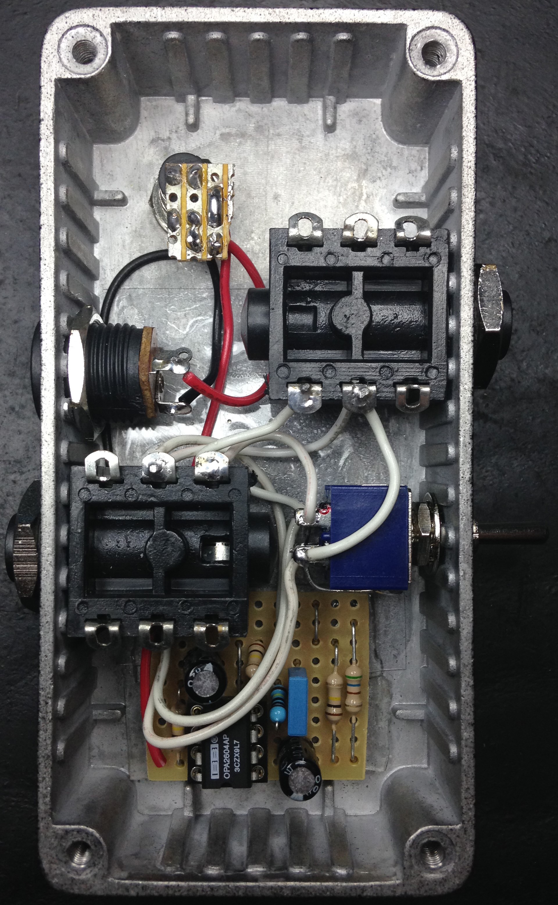 Tinha sobrando em casa uma caixa de alumínio pequena demais para montar um pedal. Muito baixa não cabia um footswitch sem tocar no fundo da caixa. Virou a opção perfeita para este circuito. Adicionei um led que fica sempre ligado e um switch lateral para bypass. O bypass coloquei com o intuito de comparar “com e sem” buffer e também ser possível desativar o buffer se algum pedal de fuzz se estranhar com ele.