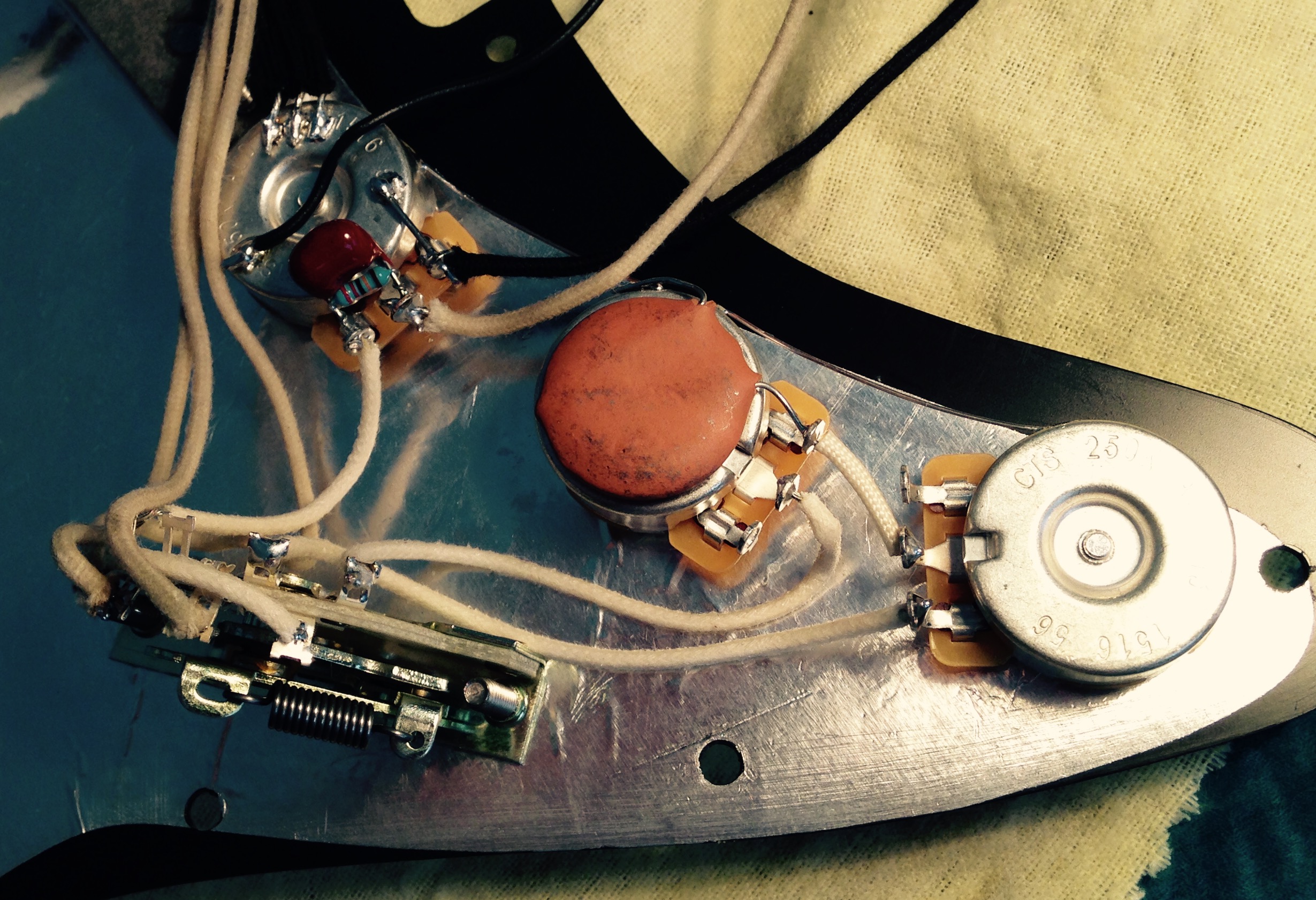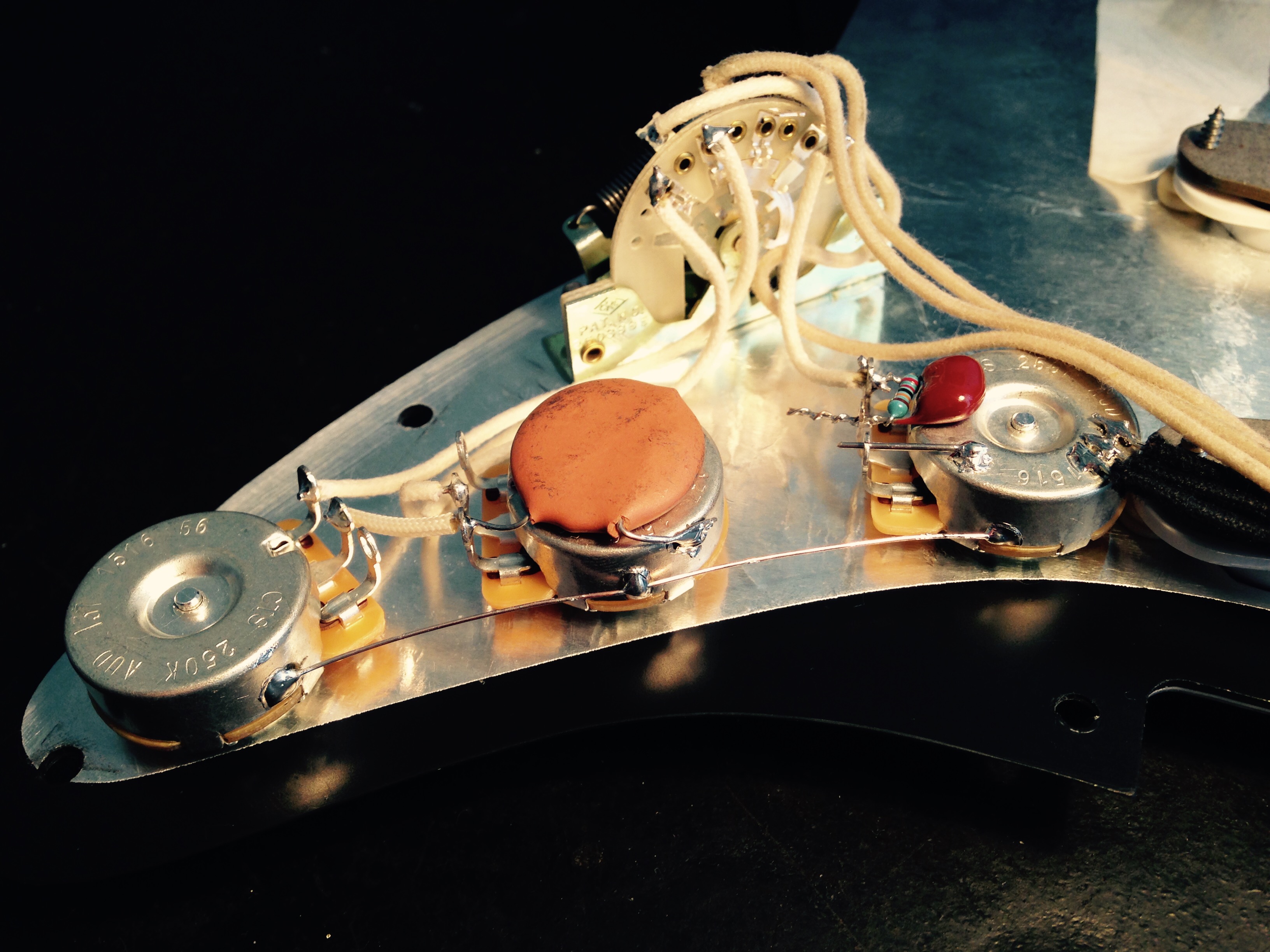 Nos últimos dois meses me dediquei a dar um trato na elétrica de todas as minhas guitarras. Sou um amante de stratocaster e este até o momento é o único modelo de guitarra que tenho em casa. Por gostar tanto desse desenho e suas características, sempre procurei saber mais sobre o assunto. Um certo dia um amigo me pediu que instalasse dois componentes que ele tinha visto na internet que se colocados no potenciômetro de volume impediam que a guitarra perdesse definição com o volume reduzido no Knob. Na época ele me trouxe o escudo da guitarra apenas, e assim o fiz. Não cheguei a testar pois só me veio um pedaço da guitarra, e também não me interessei em fazer nas minhas pois estavam com as cordas instaladas e a preguiça tomava conta do meu corpo.