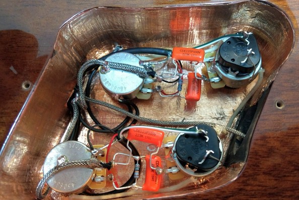 Como o kit traz tudo que é necessário e da mais alta qualidade, removi toda a elétrica antiga, incluindo fios e jack e instalei todos os componentes zero km. Como falei anteriormente, esta modificação necessita de potenciômetros com uma chave, que é acionada quando puxamos o knob para cima. Já comprei o kit que contempla isso e os dois potenciômetros de Tone possuem esta função.